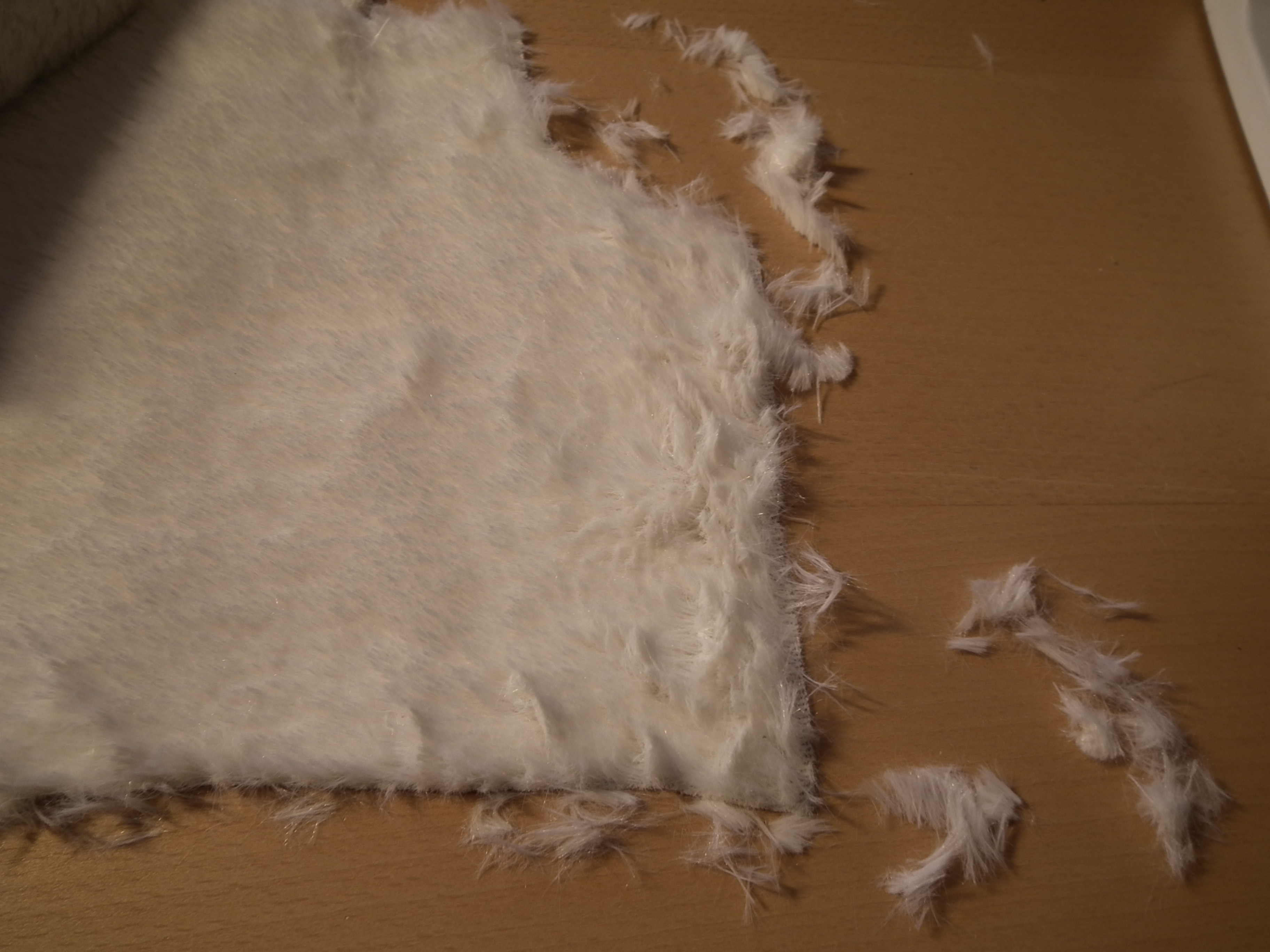 look which way the hair of the fake-fur lays and put the parts on the fabric, back and collar right at the fold (fold should be parallel to the selvages), so the hair lays down to the hem, cut the parts and try to brush of all the cut hair at the edges, the less hair you have flying around.