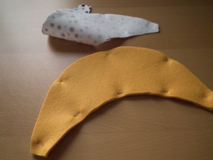 Put one shield part with the left side on the felt a the right side up, on which you put the other shield part with the right side, so that both part are face to face on the felt and pin all three together.