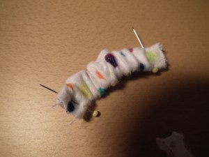 now pin fabric on the top, again right at the seams and cut again close to the pins.