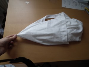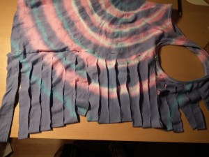 then cut the back in a right angle to the fold until some cm to the side-seam or arm-hole, try to cut them equally wide, but don’t worry to much about it, as you see, mine is not perfect either, you will not notice it after braiding though.