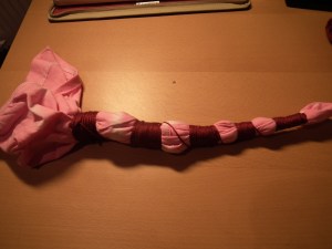 Then dye it pink, following the instructions of your dye. Then you cut the yarn off very carefully, get it in the normal form  and let the top dry.