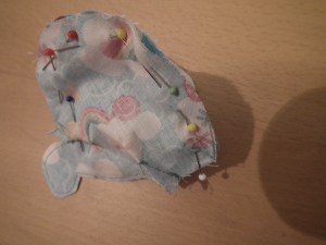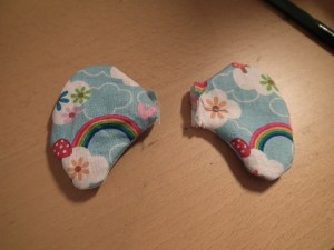 pin the short seam in the side-head-parts, pin the ears to each other, right side in and leave it open where it gets sewn to the head, and sew them