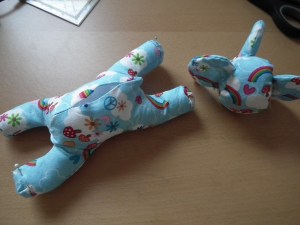 turn the right side out, as you can see my feet didnt work that well, there are small holes in the seam, I had to fix them with small hand stitches, anyhow maybe yours worked better, fill the body up with material