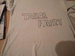 then remove the tape, put a thick paper inside and write with the textile pen what you want on your long-sleeve… I actually wanted the tailorfairy to be in one line… but I started to big, so I had to split it up
