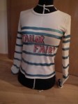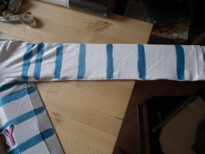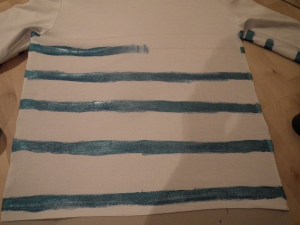 so I did another upcycle just with textile color and brushes… its actually inspired by the dvd-cover design if the movie juno, which is also made with stripes and writing in between… and I liked the look… its an old long sleeve my mum decided she wouldnt wear again… shes a size smaller then me, but with that jersey it still fits and I like tight clothes. Well here’s what I did: