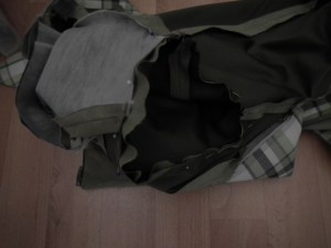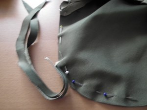 now pin the sleeves in, again carfully that front and back are right… here it doesn’t matter if the sleeve is to big just do a fold at the shoulder, it gives you space to move in the jacket and gives ease to the lining seams so they wont rip to easy