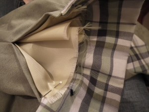 next make sure the lining sleeves isn’t turned in itself and straight in the jacket sleeve then pin the lining to the waistband