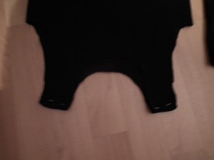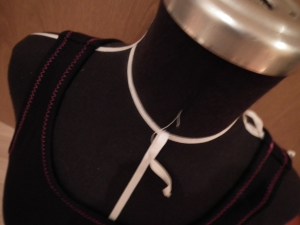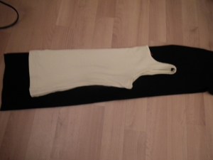 fold your cuff-fabric in the middle(so its 4 layers) and put a tanktop folded in the middle on the fold, I used the back, for my first lines so I was sure it was enough fabric, since my sis wished for tank-tops that would cover all of her breast and since shes having a cup-size of D I wanted to make sure there was enough fabric