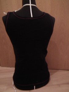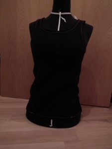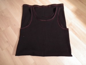 so my sis wished for tanktops. So I made her some. I used cuff-fabric that comes knitted in a ring, so it does not need side-seams, especially since it comes in the right size for S/M women that does not like to wear very tight cloth. I did not use an pattern for this one, just an other tank-top I had and then changed it up according to her wishes. It is really easy and quick to do, and the knit fabric for cuffs is thicker and not so unforgiving as light jersey to sew. I only used zigzag-stitching of my normal household sewing machine and it worked just fine, so dont be scared of elastic fabric. 😉