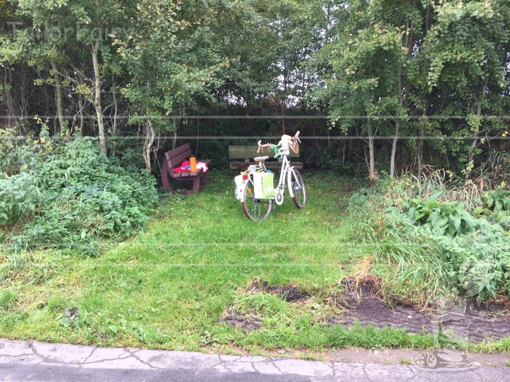 So I started 9:40 am in a cold and foggy morning with long pants, T-Shirt, sweater, and rain jacket. After half an hour I took the jacket off, it wasn’t raining, and I was getting warm. Then I took my first break at some nice benches between fields after 59:32 minutes and 17,21 km, around 10:56 am.