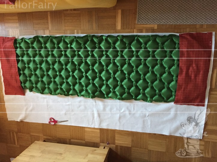 To keep the sleeping pad in place I will add and pinned some leftover fleece fabric to the ends. I thought it might be better to have it on one side so I might be able to use the rest of the Thermolam to store my clothes on, so they won’t be as cold in the morning…