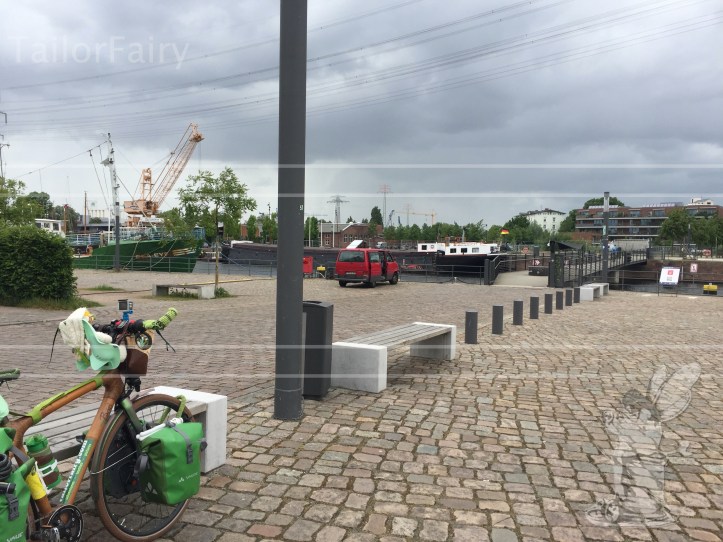 Shortly after I found the bicycle-route signs again… and lost them again. I must have crisscrossed that park quite a few times until some explained to me that I could not find the street I was looking for because that street did not exist anymore. And she also kindly helped me to get back on track. So when I finally crossed the Süderelbe (south part of the river Elbe) and reached Harburg, I took another break. A short one, because I was getting anxious over all the lost time and km.