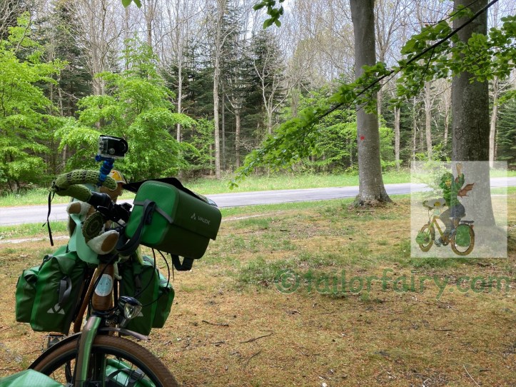 We left the campground around 11 am. The way mostly went on gravel roads through the forest, so it should not surprise me, but 2 screws got loose: we lost the camera and Charlotte’s back mudguard started rattling again. So I I had to fix that up.