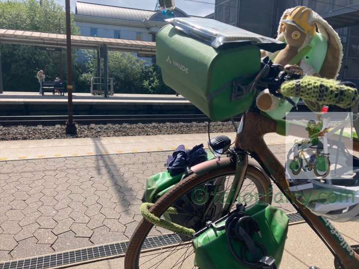 I packed all small but heavy things into my backpack, hoping I would be able to move Charlotte up and into a train with stairs then. So my setup was a little different today. Since staying around at the campground also would not help, we cycled to the train station. Where I first waited outside and then on the right platform.