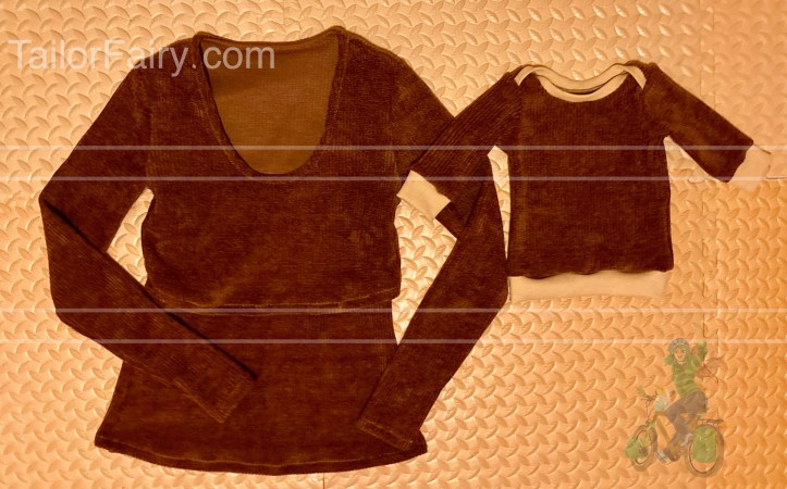 I could not find any nursing sweaters I liked so I am sewing some for myself… and with the rest of the fabrics some sweaters for my son. Here is the second set and a picture of what sewing with a baby looks like for me: